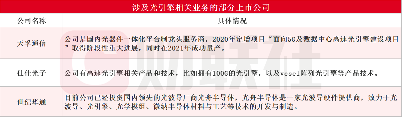 据不完全统计,涉及光引擎相关业务的上市公司主要有:天孚通信、仕佳光子、世纪华通等,具体情况如下: