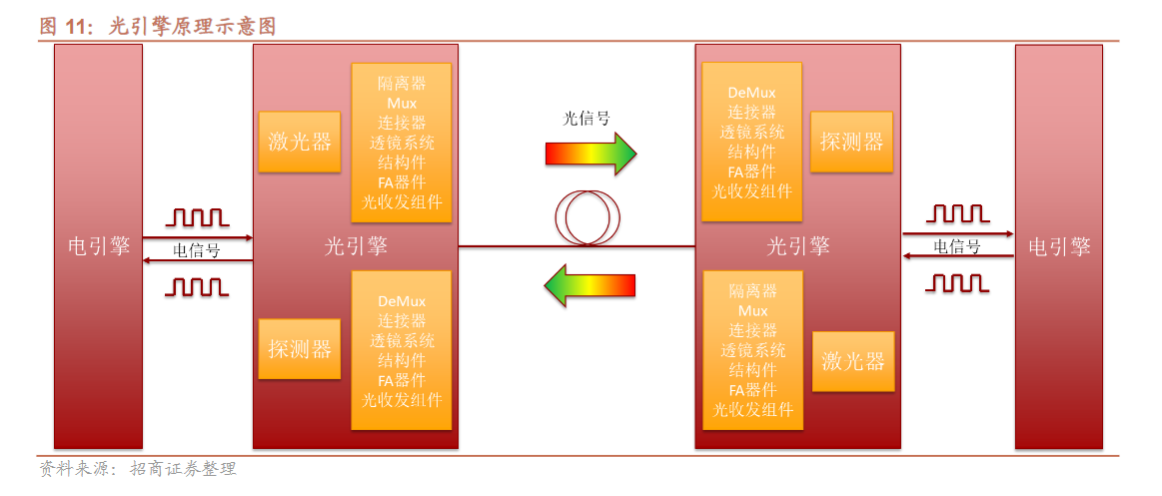 光引擎指的是光电转换模块中负责光信号处理的器件。光发射模块(TOSA)将电信号转换为光信号,光信号在媒介中(一般是光纤)传播至光接收模块(ROSA)。在TOSA端需要一个将激光器输出的光信号耦合到媒介中进行传输的器件,在ROSA端需要一个将收到的电信号以高频率、高质量传输到探测器上转变为电信号的器件。