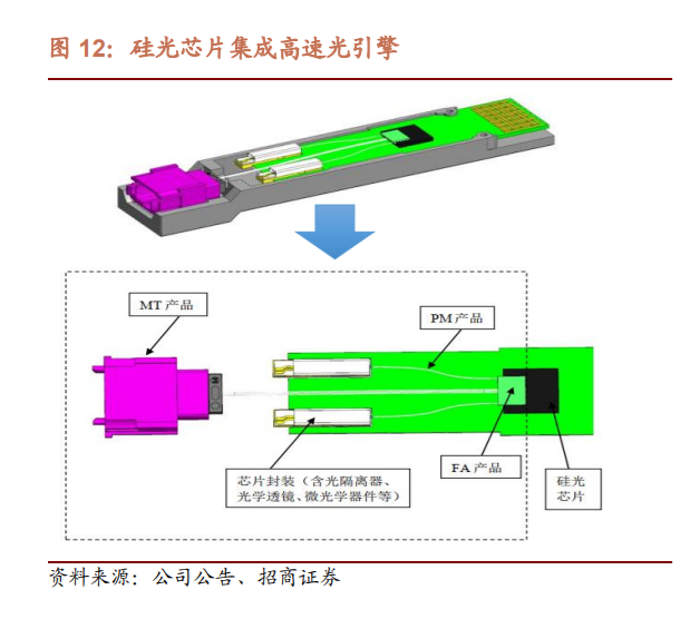 光引擎不仅可以用传统分立式元器件来集成,也可以通过硅光技术来实现。硅光引擎相对来说其集成度更高的优势使得产品物料成本更低,工艺更简单,同时可以与半导体CMOS工艺兼容,长期来看,随着数据传输速率的要求不断变高,硅光引擎将具备支配市场的实力。