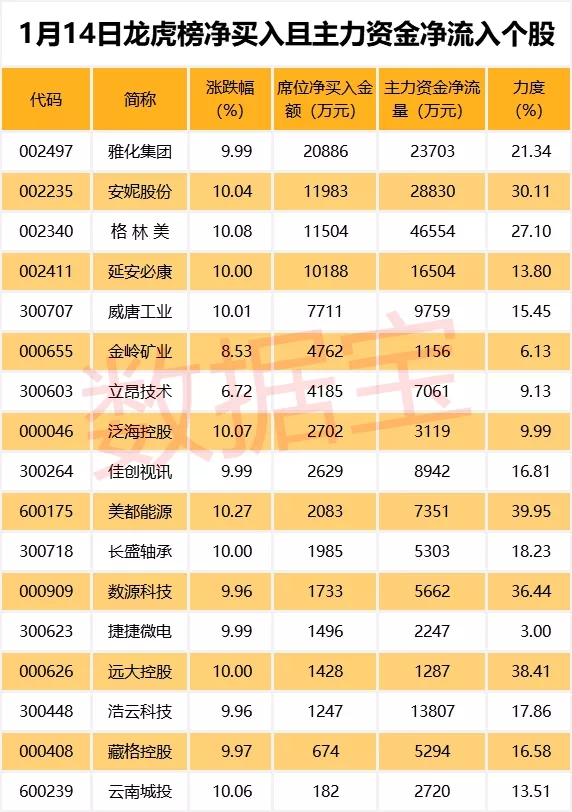 1月14日龙虎榜中机构及营业部席位资金净买入2.52亿元,其中净买入的个股有17只;净卖出的个股有15只。净买入前三名个股分别是雅化集团、安妮股份、格林美等,净买入金额占当日成交额比例达18.80%、12.52%、6.70%。