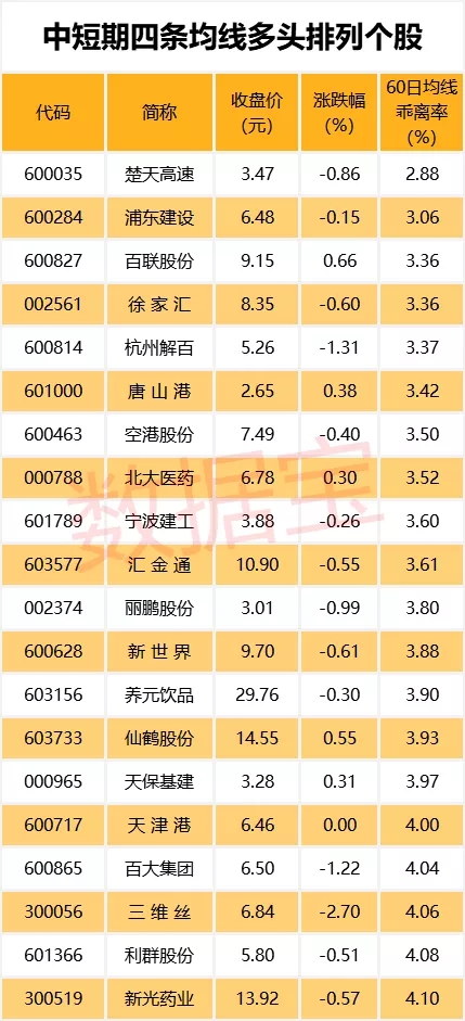 一般来说,均线多头排列代表买方力量强大,后市由多方主导行情概率较大。493只个股5日、10日、20日、60日四条均线近日呈多头排列。其中楚天高速、浦东建设、百联股份股价与60日均线的乖离率最小,分别为2.88%、3.06%、3.36%。