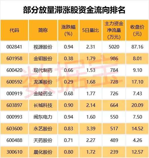 值得注意的是,35只放量滞涨股中,视源股份、金钼股份、现代制药、龙溪股份、金陵药业等个股主力资金净流入较多。