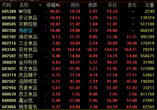 食品饮料板块今日盘中走势强劲,截至收盘,今日上市的新股均瑶健康达到44%的涨停上限,安记食品、京粮控股、保龄宝等涨停,海欣食品、三全食品涨约8%,安井食品、好想你、金丹科技等涨幅超6%。