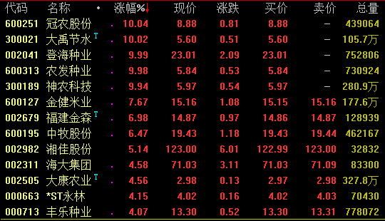 农业板块今日盘中再度活跃,截至收盘,冠农股份、大禹节水、登海种业、农发种业、神农科技等涨停,金健米业、福建金森、中牧股份等涨幅超6%。