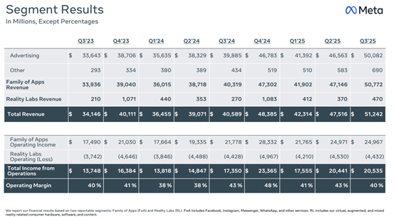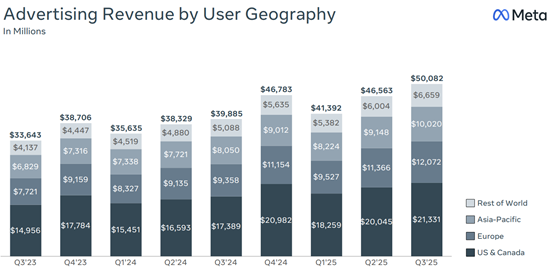 2025年Q3(截至2025年9月30日),Meta实现营收512.4亿美元,同比增长26%,主要得益于广告需求强劲及Reels视频广告收入提升。总成本与费用为307.1亿美元,同比增长32%,反映出AI与基础设施扩建带来的成本上升。营业利润为205.3亿美元,同比增长18%,营业利润率约为40%。报告净利润为27.1亿美元,但包含一次性税务支出约159亿美元;若剔除此因素,调整后净利润约186亿美元,每股收益(EPS)约7.25美元。
