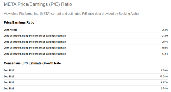 从企业价值倍数(EV/EBITDA)来看,Meta当前约在 10–11 倍区间,低于自身历史均值(约 13–14 倍),也明显低于谷歌、微软等同行的 15–18 倍水平。考虑到公司 EBITDA 仍在两位数增长区间内,且广告效率和视频变现能力不断提升,这种估值折价缺乏基本面支撑。