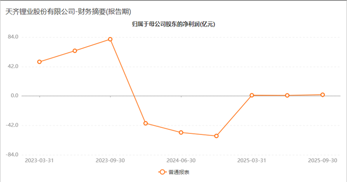 财务数据显示,2025年前三季度,天齐锂业实现营业收入73.97亿元,同比下降26.5%;归母净利润为1.8亿元,同比增长103.16%;截至2025年9月30日,公司资产总额为739.57亿元,负债总额225.58亿元,资产负债率为30.5%。