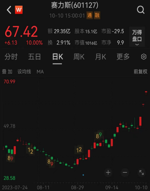 今日市场焦点,无疑是华为概念股。华为汽车概念股中,赛力斯涨停,收获3连板。8月28日以来(26个交易日),赛力斯股价累计大涨110%。
