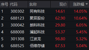 以存储为首的半导体芯片股午后走强,同有科技拉升涨逾14%,聚辰股份涨逾10%,江波龙、佰维存储、澜起科技、朗科科技等大幅走高。