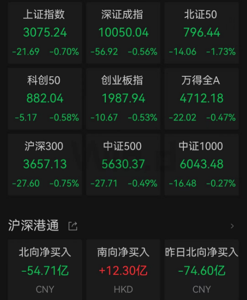 10月10日,A股冲高回落,三大指数收跌。截至收盘,沪指跌0.7%,深成指跌0.56%,创业板指跌0.53%。北向资金全天净卖出54.71亿元,其中沪股通净卖出47.57亿元,深股通净卖出7.15亿元。
