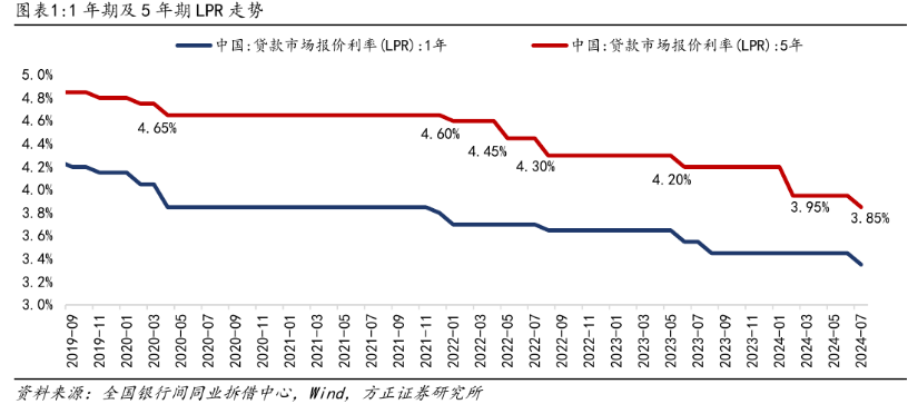 中国人民银行在2024年7月22日宣布的贷款市场报价利率(LPR)的下调情况。报告指出,此次1年期和5年期以上LPR分别下调了10个基点,为年内第二次降息,旨在减轻按揭贷款压力。