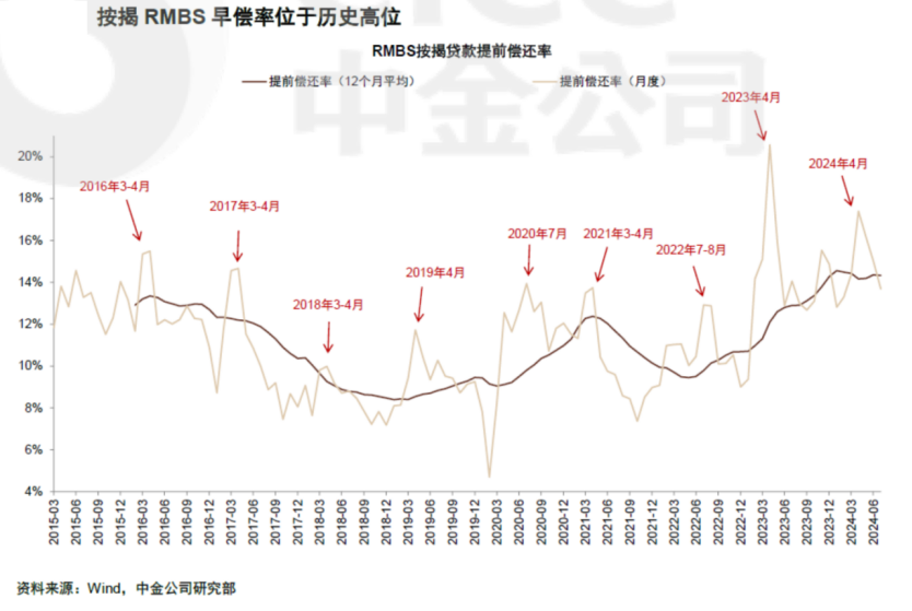 存量房贷利率亦有望下调。根据贝壳研究院,5月百城首/二套房贷利率分别为3.45%/3.90%,同比分别下降55bp/101bp,环比分别下降12bp/26bp。根据央行数据,截至6月新发放房贷利率3.45%,同比下降66bp,环比下降17bp,处于历史最低水平。如果考虑7月的LPR下调估计新发放利率在3.35%左右,相比2023年12月的3.97%下行62bp,而存量按揭利率下调幅度仅为35bp,存量房贷利率和新增利率的利差再度回到约60-70bp的高位,并且大部分重定价在2025年年初。按揭早偿率仍位于14%左右的高位,并且可能存在使用消费和经营贷置换按揭的空间。