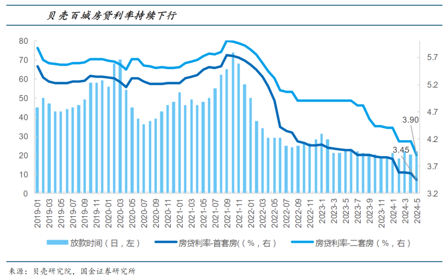 新增贷款利率自2024年5月起,全面进入3%利率时代,存量和新增利率差距导致市场上提前还贷的现象加剧,在此背景下存量房贷下调空间较大。2023年11月央行提到,首套存量房贷利率约4.27%,结合今年以来LPR的下降,目前存量房贷利率平均水平预计约4%。上轮23年8月降约75BP。