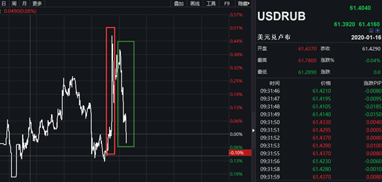 行情数据显示,美元兑俄罗斯卢布汇率短时间内出现跳涨,不过后面又快速回落。