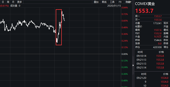 国际金价也出现异动。COMEX黄金期货主力合约短时间跳涨,盘中一度冲高至1557.6美元/盎司。