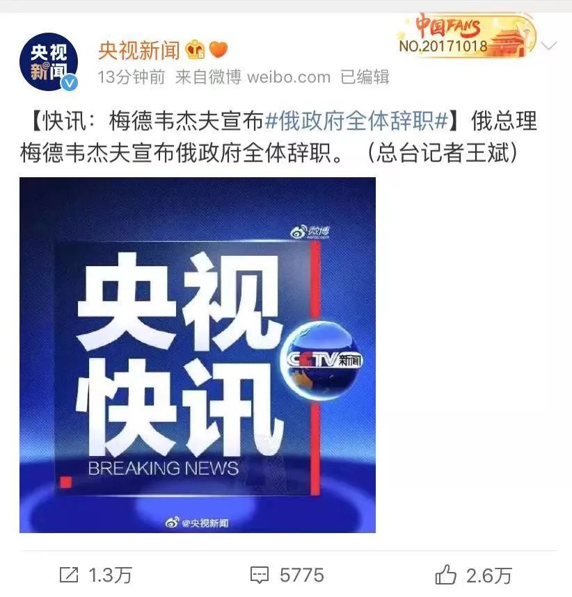 据央视新闻、环球时报等媒体消息,俄总理梅德韦杰夫宣布俄政府全体辞职。