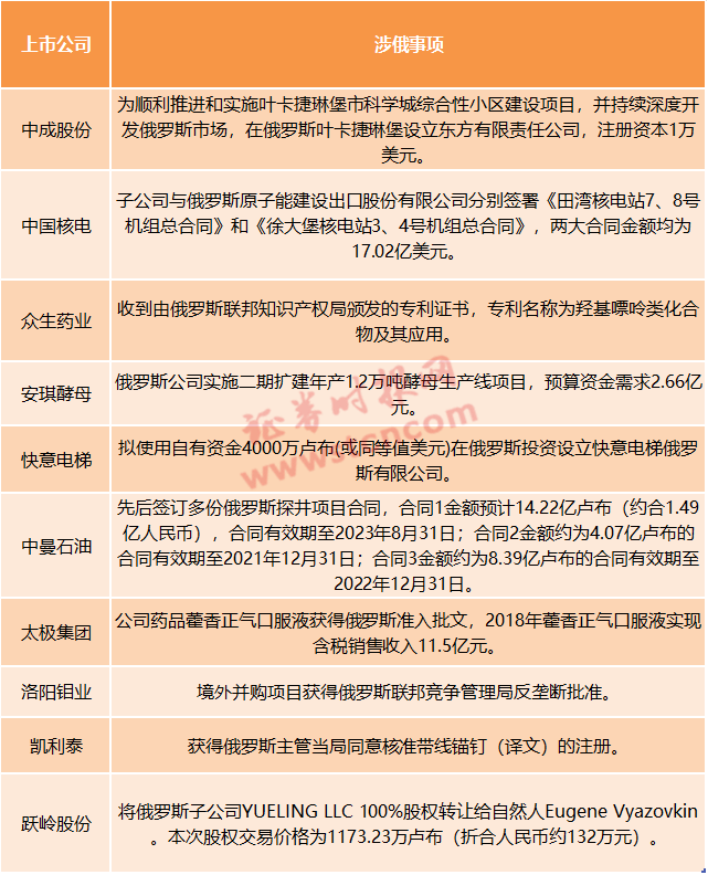 据不完全统计,2019年以来,10家上市公司公布与俄罗斯相关的事项。其中中成股份、快意电梯拟在俄罗斯设立子公司;中国核电、中曼石油与俄方公司签订多份合同;众生药业、太极集团、凯利泰、洛阳钼业等获得俄方颁发相关专利、批准或准入;安琪酵母拟扩充在俄的生产线;跃岭股份则提前出手了俄罗斯子公司。