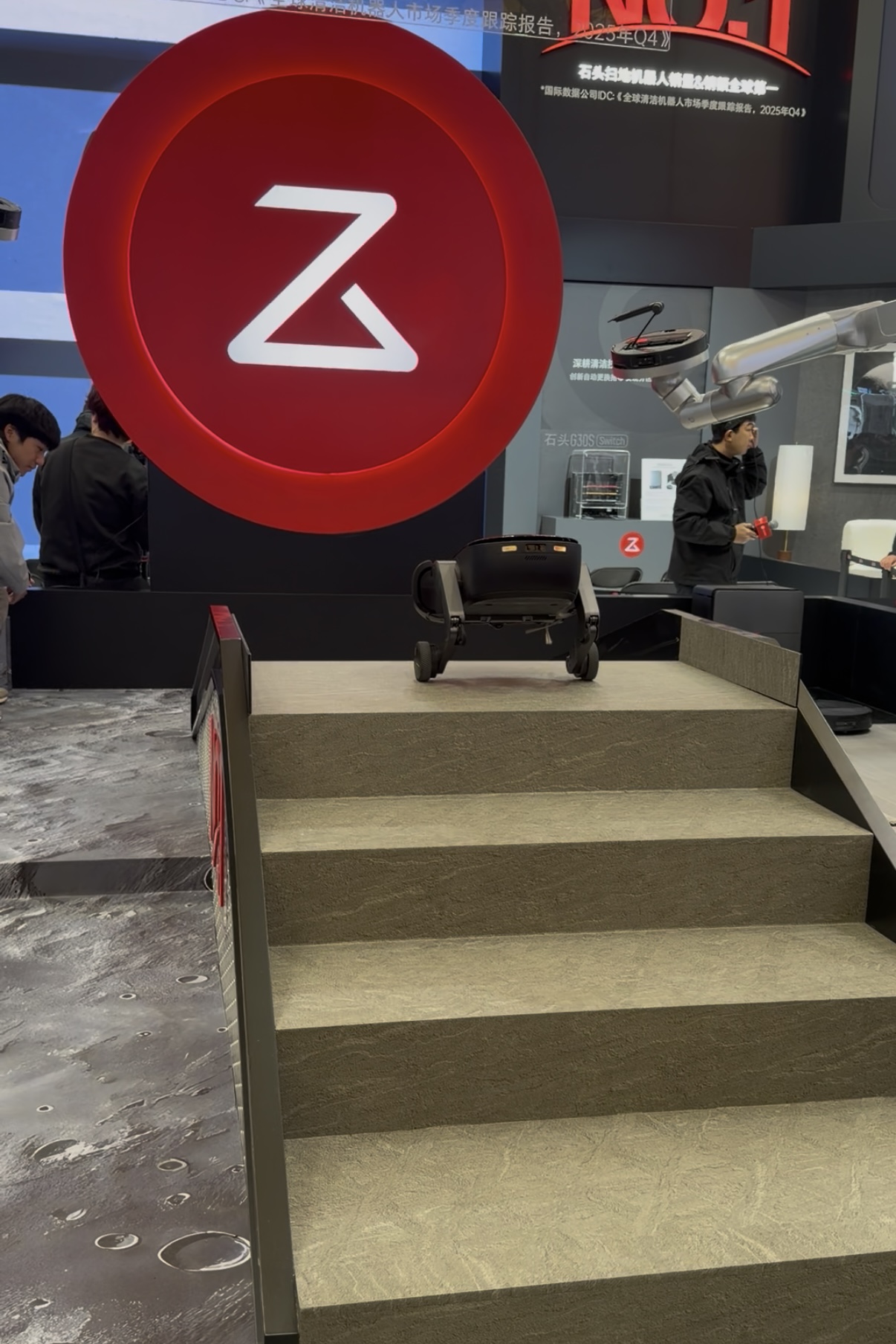 石头科技展出了全球首款轮足扫地机器人G-Rover,每条轮腿具备独立伸展和升降功能,可在楼梯和斜坡等环境中稳定移动并完成清洁作业,将扫地机器人的工作范围从平面拓展到了楼梯。