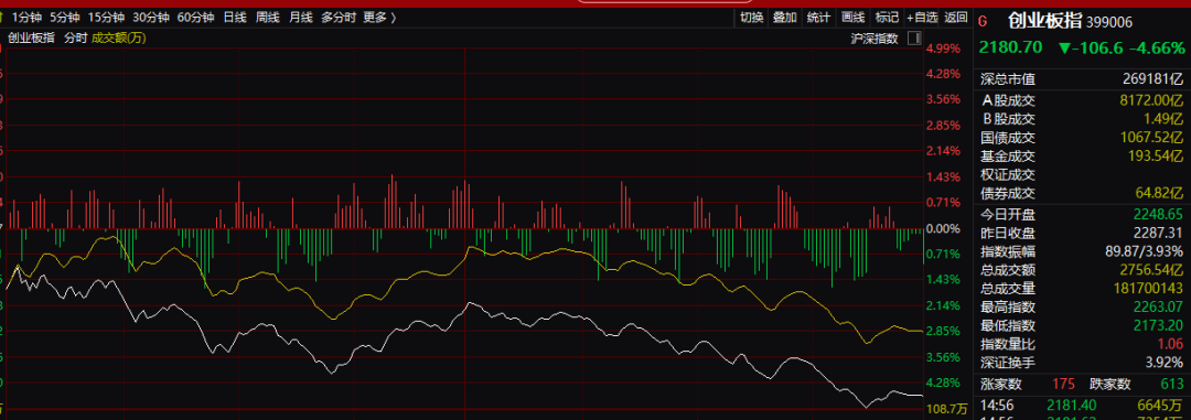这些板块的杀跌也引发了创业板指数的震动。创业板指全天收盘,跌去近5%,而且明显弱于大盘。要知道在2月3日,大盘杀跌的时候,创业板指数还强于沪指。