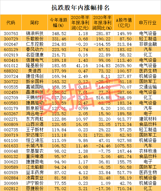 抗跌股中,不乏市场追捧的大牛股。数据显示,今年以来共有22股涨幅已翻倍,锦浪科技、乐歌股份、仁东控股累计涨幅居前三位。锦浪科技累计涨幅348.52%排在首位,公司主营业务为光伏并网逆变器、风力并网逆变器及分布式风力发电机组的研发、生产、销售和服务。