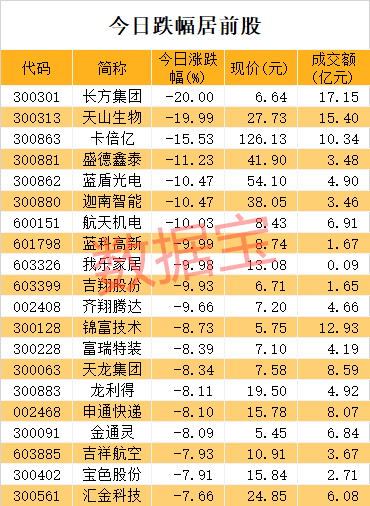 今日头条、免税店、小金属、稀土永磁、半导体硅片等题材跌幅居前,今日头条概念龙头天龙集团、省广集团、凯撒文化均跌超5%。截至收盘,卡倍亿、盛德鑫泰、蓝盾光电等4只注册制新股跌10%以上,此外主板股票航天机电、蓝科高新、我乐家居、吉翔股份跌停。