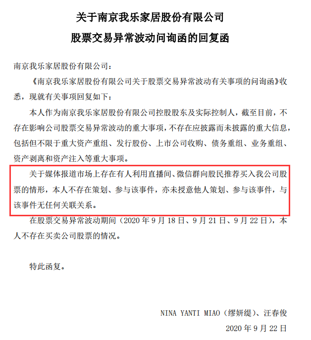 疑似出现“杀猪盘”的我乐家居已连续两日跌停,我乐家居今日收盘后公告回应称,公司关注到有媒体报道市场上存在有人利用直播间、微信群向股民推荐买入我公司股票的情形。经公司、控股股东、实际控制人、董事、监事及高级管理人自查,各方均未策划、参与该事件,亦未授意他人策划、参与该事件,与该事件无任何关联关系。目前,公司生产经营情况一切正常,公司无应披露而未披露的重要信息。