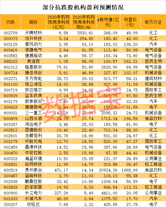 根据五家以上机构一致预测数据,上述抗跌股中有31股今年净利润有望同比增长。机构预测净利润增幅最高的是天赐材料,预测净利润均值6.58亿元,同比增长39.31倍。天赐材料主要产品为日化材料及特种化学品、锂离子电池材料。民生证券表示,近期六氟磷酸锂价格底部反弹,由于六氟磷酸锂的扩产周期较长,预计下半年六氟磷酸锂供需偏紧,天赐材料成本优势扩大。净利润预测增幅居前的还有当升科技、春风动力、信捷电气、捷昌驱动、美迪西等。