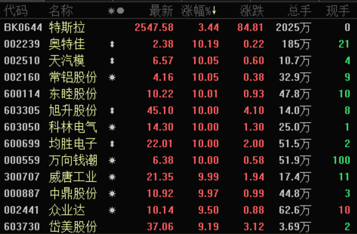 1月7日,马斯克现身特斯拉上海工厂,出席中国制造Model 3向社会用户的首次交付仪式。而在资本市场,相关概念股已连续多个交易日被热炒。今日,在两市震荡走弱的背景下,特斯拉概念再度发力,奥特佳、天汽模、常铝股份、旭升股份、科林电气、威唐工业、云海金属、众业达、东睦股份、北特科技涨停。