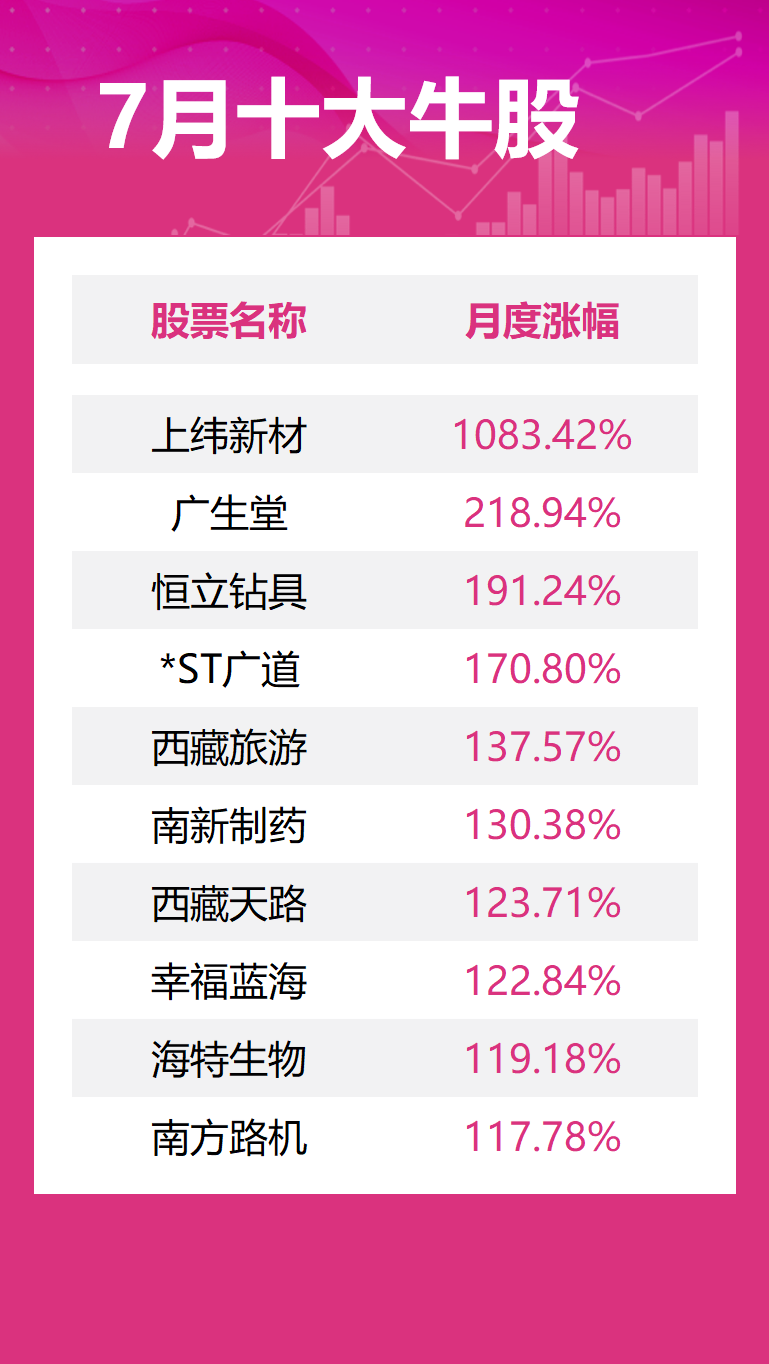 7月十大牛股出炉:上纬新材逾1083%涨幅问鼎榜首