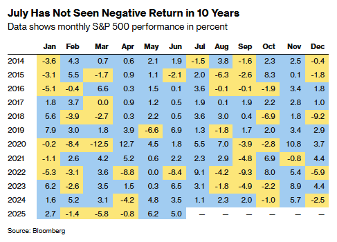 历史先例表明,标普500指数有望延续自4月低点以来25%的涨幅。该指数上次在7月出现月度下跌还要追溯至2014年。