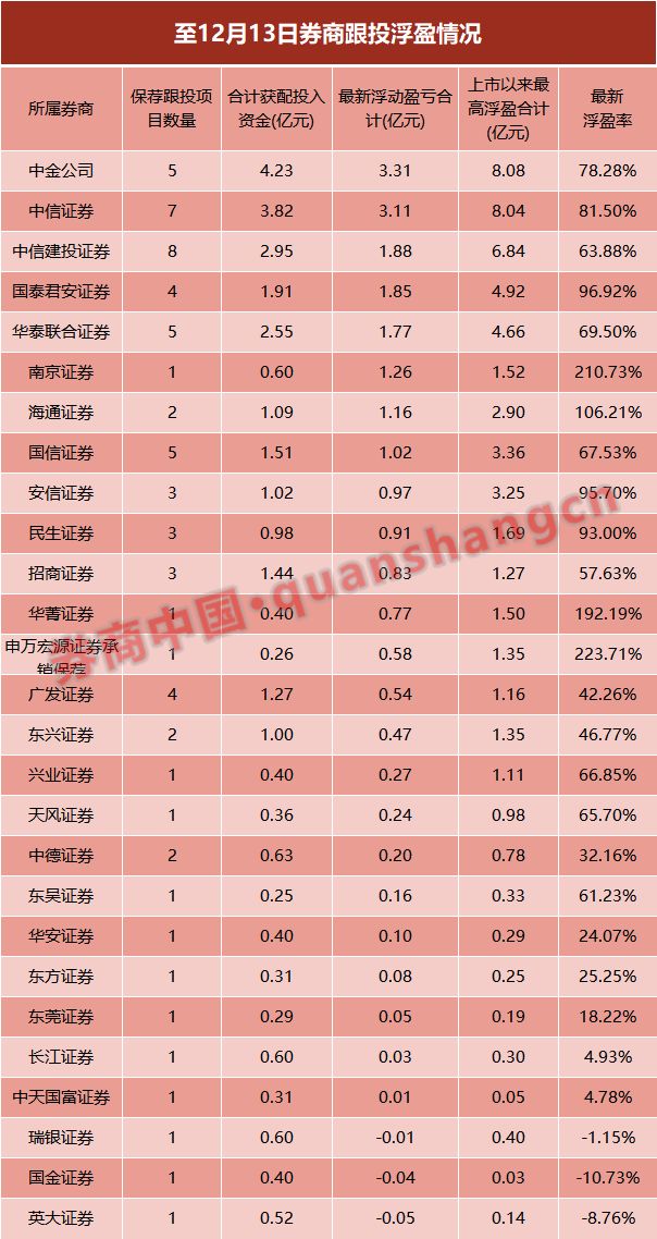 目前来看,申万宏源承销保荐、南京证券、华菁证券、海通证券等四家券商跟投浮盈率超100%,大部分券商跟投浮盈率在50%左右,也有数家券商跟投呈现浮亏。