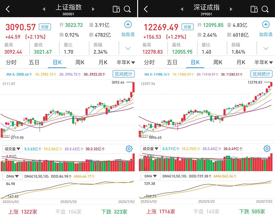 截至7月2日收盘,上证指数涨2.13%,报3090.57点;深证成指涨1.29%,报12269.49点;创业板指涨0.2%,报2424.39点。