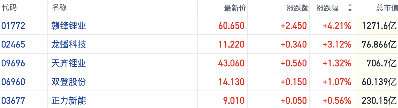 截至发稿,赣锋锂业(01772.HK)涨超4%,龙蟠科技(02465.HK)涨逾3%,天齐锂业(09696.HK)等公司跟涨。
