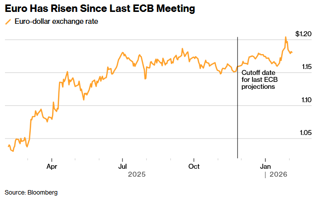 欧洲央行的政策制定者正在消化2026年初纷繁复杂的一系列事件,包括美国当局对美联储独立性的威胁、强行抓捕委内瑞拉总统马杜罗、以及美国总统特朗普关于加征关税关税的最新威胁——此次矛头指向格陵兰。其结果是美元走弱,并一度将欧元推升至2021年以来的最高水平。在欧洲经济看似站稳脚跟之际,这可能给该地区的出口商带来麻烦,并将通胀率进一步拉低至欧洲央行2%的目标水平以下,尽管油价和天然气近期的价格上涨正在抵消这一风险。