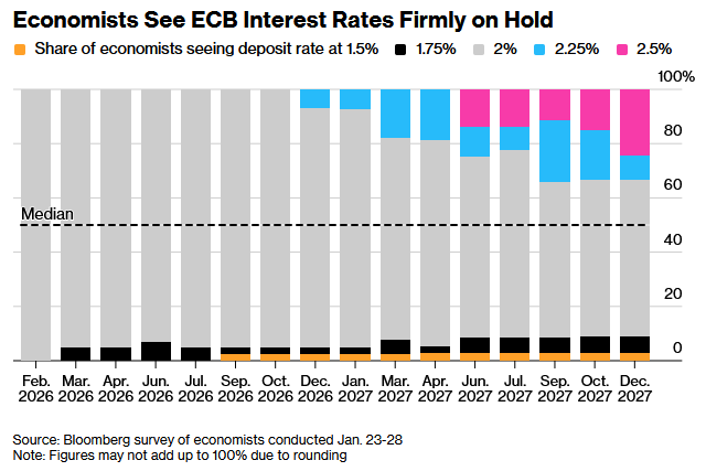 经济学家戴维·鲍威尔和西莫纳·德莱·基亚耶表示:“欧洲今年开局地缘政治动荡,欧洲央行可能将继续关注大局而非细节。这意味着它很可能会对近期涉及格陵兰的美国贸易争端、通胀率略低于2%目标以及欧元升值不予理会。”