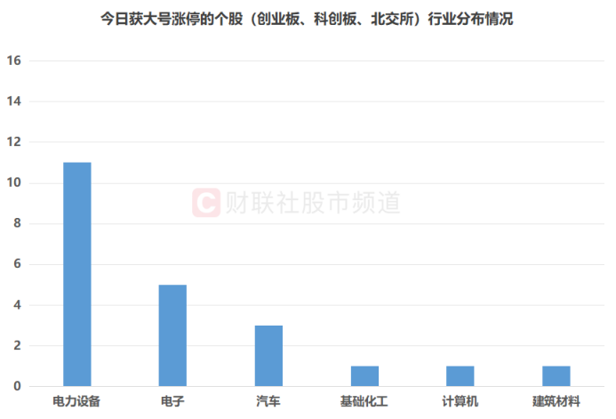 一直以来,“大号”涨停股凭借其亮眼涨幅常成市场焦点,尤其是其聚焦方向,更是成为投资者热议话题。以今日数据统计,累计共有22只“20cm”或“30cm”股录得涨停行情。分行业板块(申万一级)来看,电力设备股数量位居第一,其占比高达50%,电子、汽车股也相对较多,分别占比近22.7%、13.6%,同时还涵盖基础化工、计算机、建筑材料股。