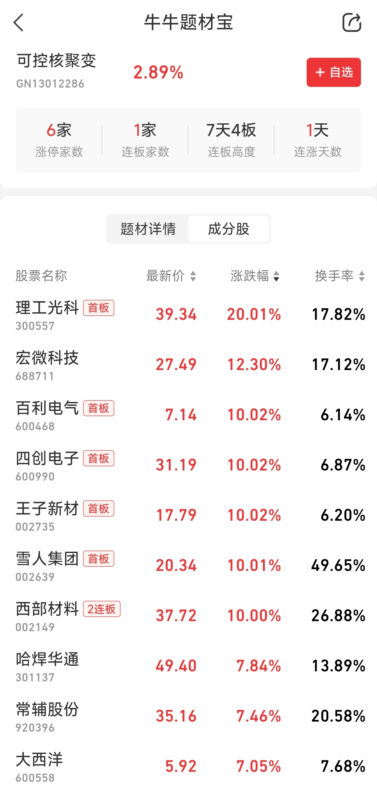 具体到盘面上,美股特朗普媒体科技集团大涨超40%,美股核聚变概念股大涨。A股王子新材涨停,常辅股份高开超10%,爱科赛博、哈焊华通、雪人集团、中洲特材涨幅靠前。
