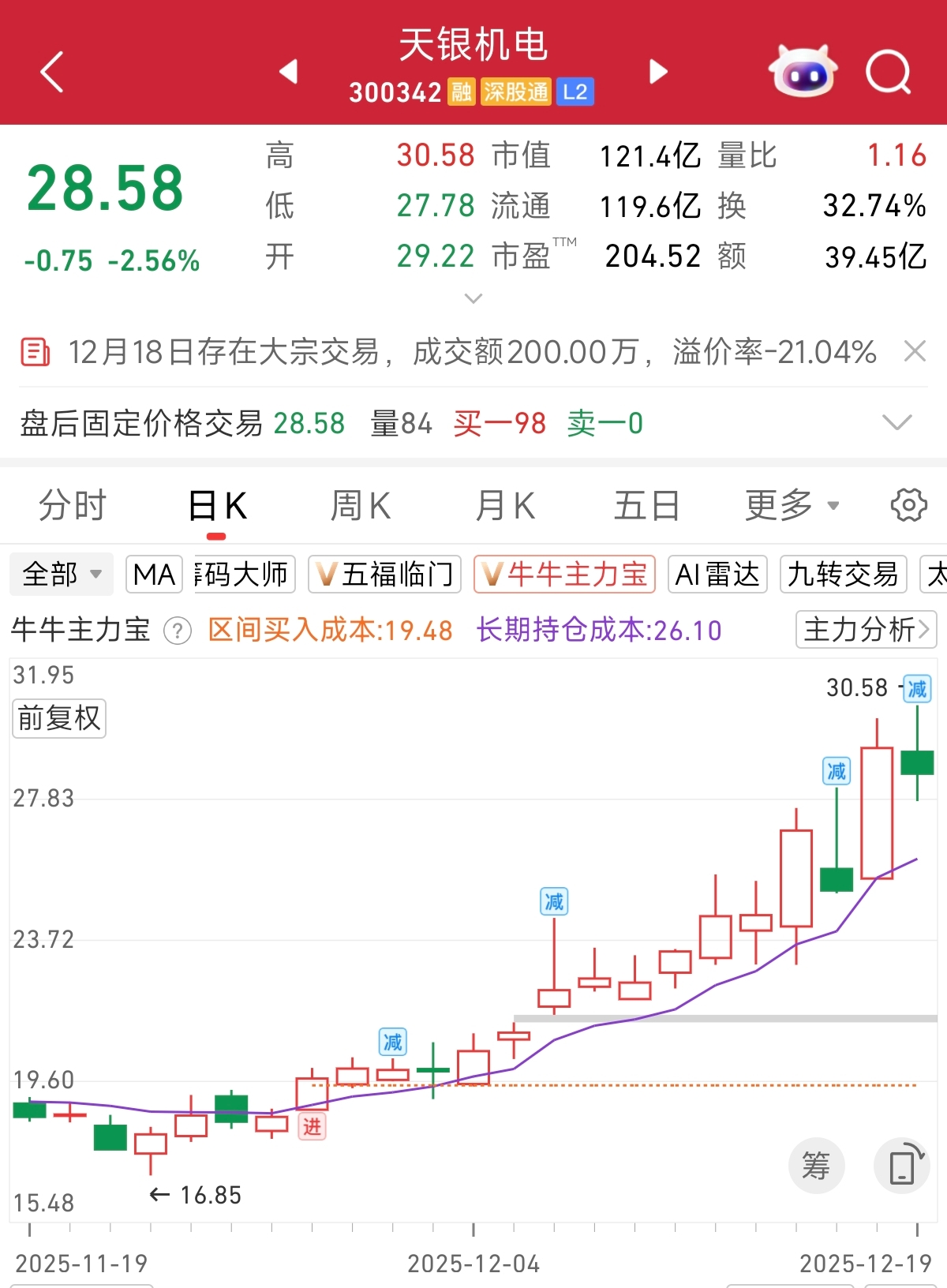 商业航天还在等长征十二甲发射的消息,但是概念股已经开始分化,存量博弈下,容易有止盈盘出货。昨天本栏目刚提醒过,根据“主力宝”监控,天银机电的主力在逢高减持,今天好巧不巧就下跌了2.3%。开通了“主力宝”朋友,一定要多用用,关键时候能起大作用,花小钱办大事儿。还没开通过的朋友,点此解锁,而且现在有活动,首次订阅减50,只要18块钱就能获得这个盯紧主力动向的利器,点击可查看详情>>