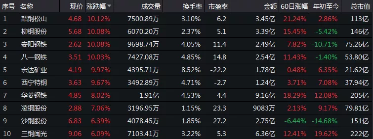 钢铁板块涨幅最大,前十名个股涨幅均超过6%。其中,韶钢松山(000717)、安阳钢铁(600569)、柳钢股份(601003)、八一钢铁(600581)涨停。
