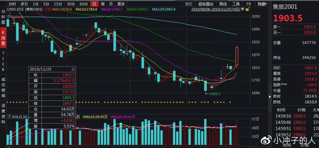 以焦炭主力合约2001的走势为例。11月11日,焦炭2001合约价格最低触及1685.5元/吨,创下2019年3月底以来的最低纪录,当日收报1699元/吨。此后,焦炭主力合约价格开始触底反弹,11月14日和11月19日两天涨幅超过2%,以11月25日的收盘价计算,半个月来焦炭的累计涨幅达到12.04%。