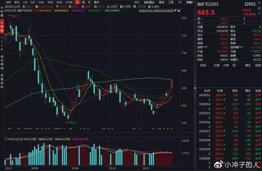 11月11日,铁矿石主力2001合约价格收报591.5元/吨,接下来的10个交易日全部上涨,“十连阳”之后,铁矿石价格累计上涨了12.51%。