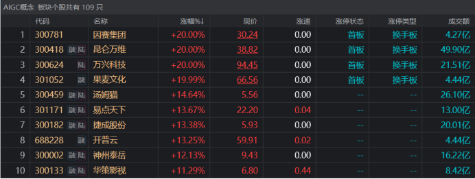 今日(12月1日),AI概念再度聚焦市场人气,多只概念股迎来大涨。截至收盘,因赛集团、昆仑万维、万兴科技、果麦文化20cm涨停,网达软件、引力传媒、焦点科技、南兴股份也封板涨停,此外,汤姆猫、易点天下、捷成股份、开普云、蓝色光标等多股涨幅超10%。
