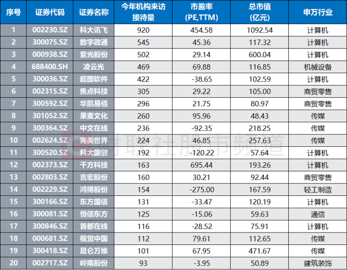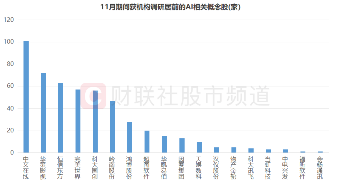 此外,不少AI概念股近期也得到机构的重点关注。截至11月30日,累计共有18只概念股于11月获机构调研,其中,中文在线、华策影视、恒信东方、完美世界、科大国创月调研量超50家。若以年度数据统计,则有19股今年以来获100家以上机构调研,其中,科大讯飞年调研量最高,数字政通、紫光股份、凌云光、超图软件、焦点科技、华凯易佰、果麦文化也获机构重点关注。