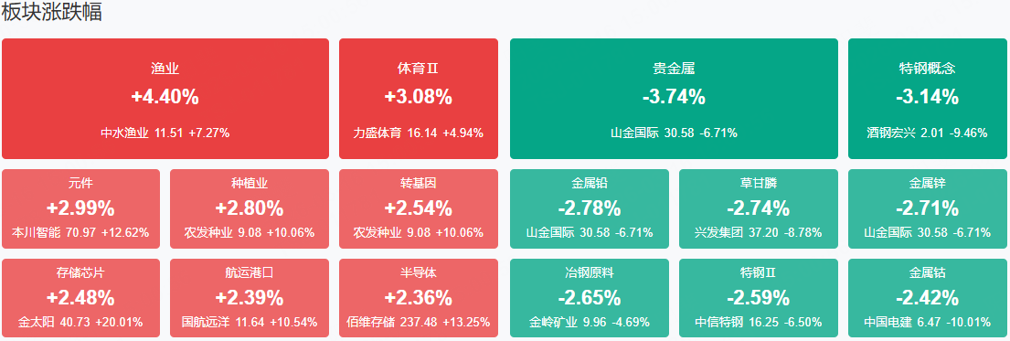 板块方面,海洋经济、农业、存储芯片、航运等板块表现活跃,贵金属、钢铁、等板块表现落后。截至收盘,沪指跌0.26%,深成指涨0.19%,创业板指涨1.41%。