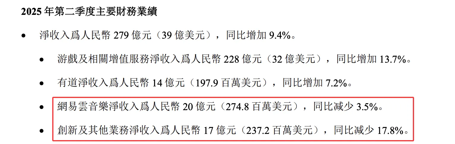 网易方面,尽管其游戏核心业务表现不俗,二季度相关服务净收入为228亿元,同比增加13.7%,但网易云音乐及其它创新业务收入均出现下滑。