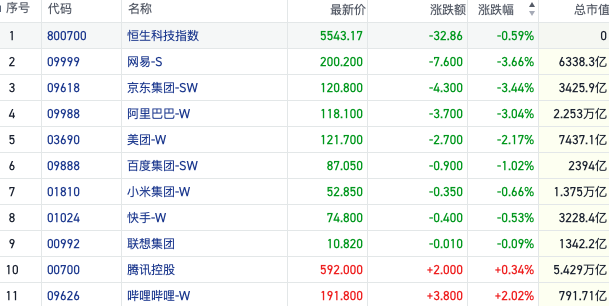 截至收盘,今日京东集团-SW(09618.HK)、网易-S(09999.HK)均跌超3%,阿里巴巴(09618.HK)、美团-W(09988.HK)也明显跟跌。