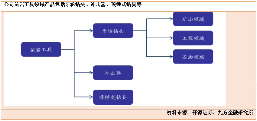 凿岩工具:产品包括牙轮钻头、冲击器等,主要应用于矿山开采、石油钻采、煤炭开采和基建四大领域。公司拳头产品矿用牙轮钻头市占率国内第一,澳洲、南美市场第三,技术水平已与海外巨头山特维克、阿特拉斯等相媲美。