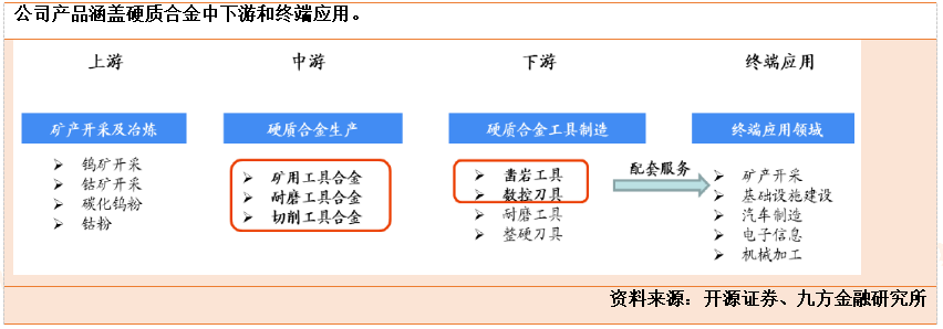 公司产品涵盖硬质合金中下游及终端应用领域,打造产业一体化平台。公司产业链中游主要产品包括矿用工具合金、耐磨工具合金以及切削工具合金等。其中中游硬质合金产品定位中高端;下游牙轮钻头拳头产品已具备与山特维克、阿特拉斯等跨国公司在牙轮钻头等矿用硬质合金工具细分领域竞争的能力,此外,公司积极布局数控刀具,于2022年1月收购株洲韦凯66%股权。