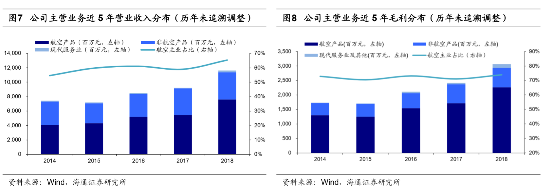中航机电是航空工业旗下航空机电系统的专业化整合和产业化发展平台,承担航空机电产品的市场开拓、设计研发、生产制造、售后服务、维修保障的全价值链管理,为航空装备提供大专业配套系统产品,在国内航空机电领域处于主导地位。公司航空产品在近年来保持了较高的毛利率水平,稳定在30%左右,净利润逐年上涨,由2014年的3.82亿元增加到2018年的9.07亿元,年均复合增速为24.16%。