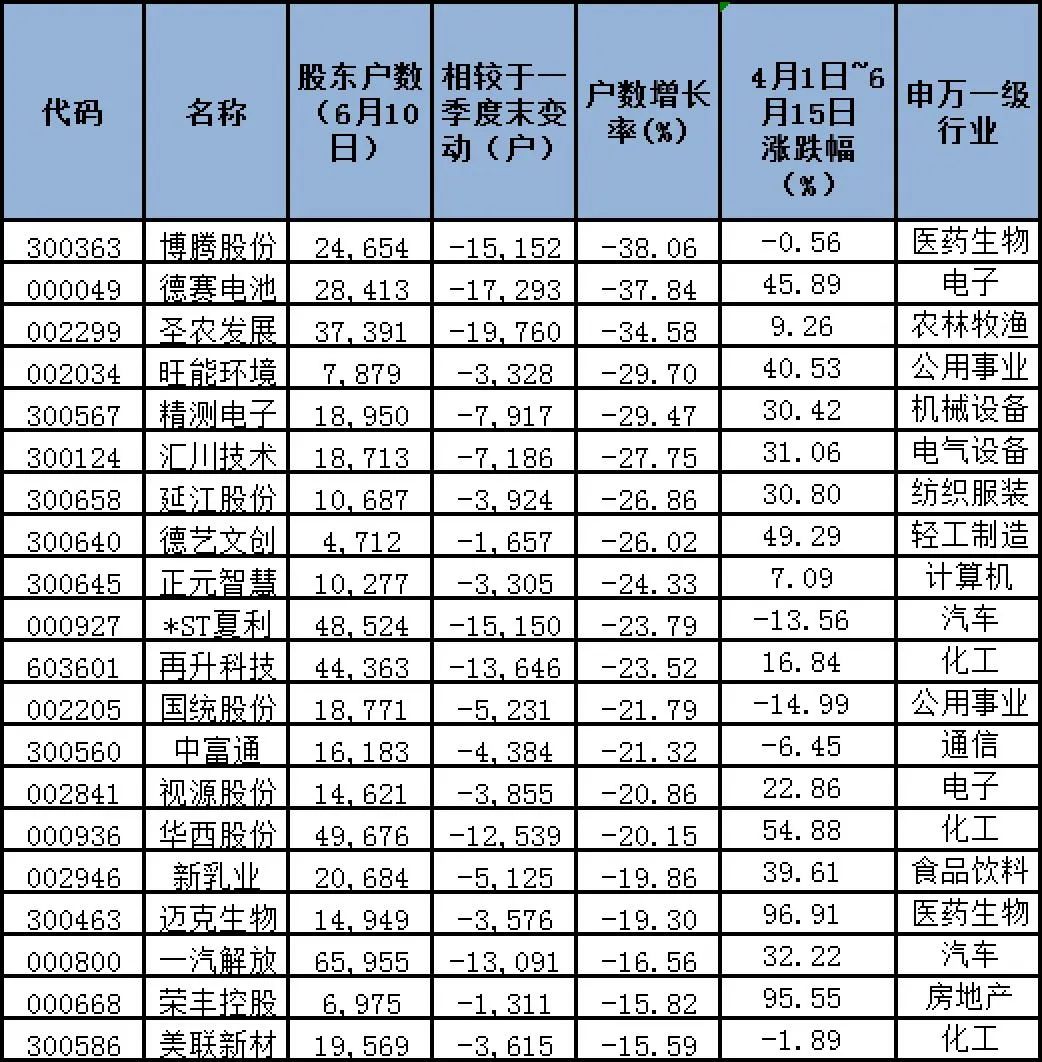 据记者梳理数据发现,剔除今年以来上市的新股(新股上市筹码快速发散,股东户数变动较快,参考意义较低),两市共有209家公司于6月10日最新披露了股东户数情况。其中有134家相较于一季度末出现下降,包括德赛电池、视源股份、汇川技术、迈克生物等在内的15家公司股东户数降幅均超过20%,降幅超过10%的有44家,79家公司股东户数降幅超过5%。